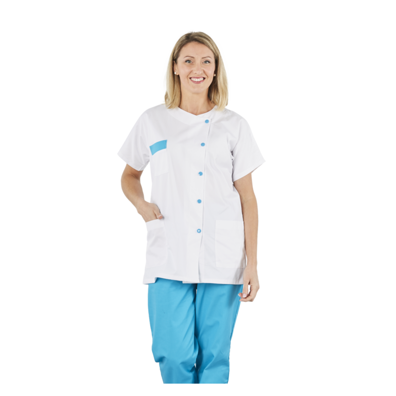CARACTERISTIQUES : Col rond, manches kimono, 2 poches plaquées, fente côté, fermeture par 5 pressions calottées, parement poche poitrine hauteur milieu dos 75 cm